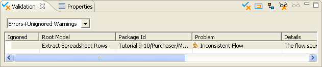 The model editor will zoom to the Extract Spreadsheet Rows with the last flow arrow highlighted in red to pinpoint the validation warning, as in the following screenshot: