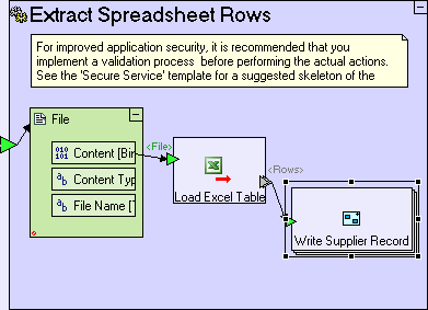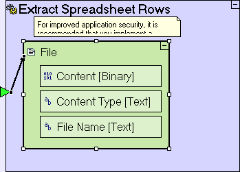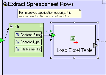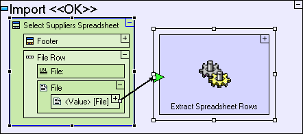 The <Value> data element of the File input field is passed to the Extract Spreadsheet Rows process, and into another File data element: