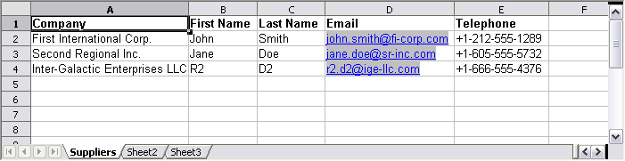 The data appears in the Suppliers sheet, and is formatted in a tabular format, where the first row defines column names (Company, First Name, Last Name, Email, and Telephone) and subsequent rows contain supplier information (one per row).