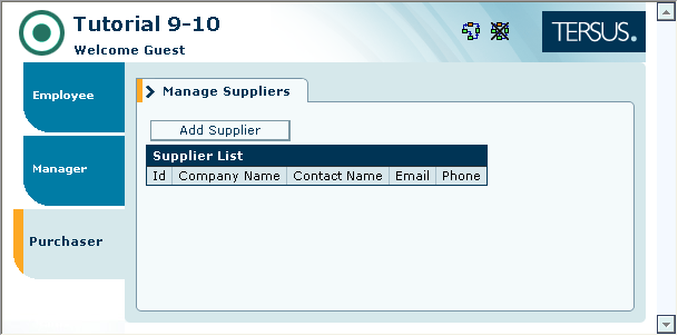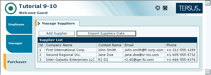 For the sake of this tutorial, we shall assume that the purchaser in our organization has been maintaining the list of approved suppliers in a spreadsheet. A sample spreadsheet, Suppliers.xls is provided in [tersus root]/workspace/Tutorial 9-10.