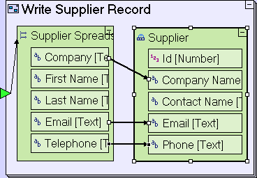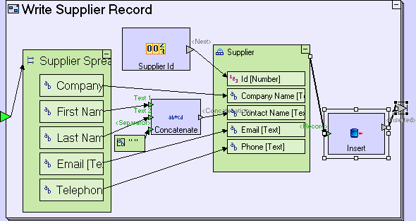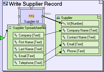 As there are usually multiple rows extracted from the spreadsheet (which is the reason the <Rows> exit is repetitive), the Write Supplier Record process should be marked as repetitive – meaning that it is executed once for each row which is extracted by Load Excel Table: