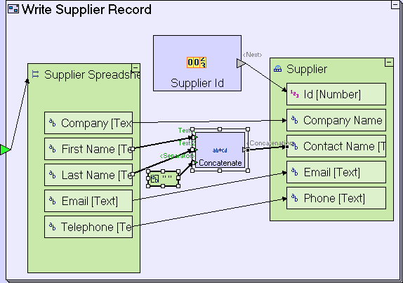 Create a flow linking Concatenate/<Concatenation> to Supplier/Contact Name.