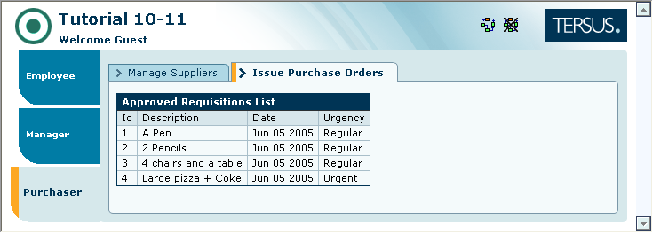 We shall now begin modeling the issuing of Purchase Orders (POs) by purchasers. We shall start with the display of a tabular list of requisitions approved by managers. This table will differ from previously modeled tables – we will specify which columns to display and in which order, instead of relying on defaults.