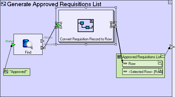 Create a flow linking the Convert Requisition Record to Row/Row exit to Approved Requisitions List/Row.