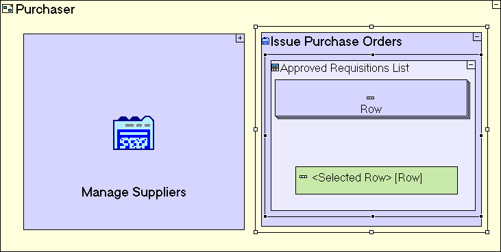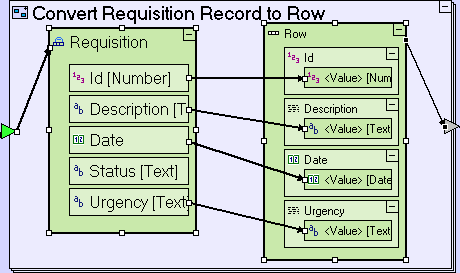 Up to this point, the Generate Approved Requisitions List process, is similar to other Generate... processes we modeled. From this point on, the modeling changes. As the table will not accept the records found directly, we must create a process that converts (or maps) the fields of the Requisition database record to a Row display data element in the table:
