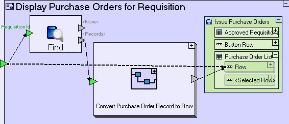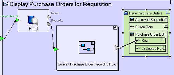 Create a flow linking the Convert Purchase Order Record to Row exit to Issue Purchase Orders/Purchase Order List/Row.