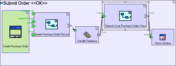 Select the flow linking the Handle Database/<Done> exit to the Close Window/Control trigger, and drag the target to the Refresh Issue Purchase Orders View/Control trigger.