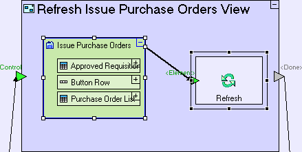 Add a Basic/Action. Name it Refresh Issue Purchase Orders View. Add a Control trigger and a <Done> exit to it (using the Add Element context sub-menu).