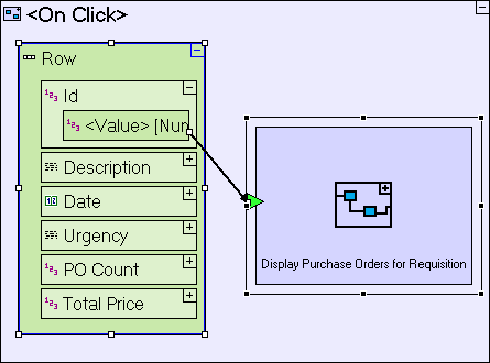 The <On Click> process should retrieve all purchase orders which are linked to the clicked requisition, so it first needs to get the Id of the requisition represented in this row. The requisition id for the the clicked row is available through an ancestor reference: