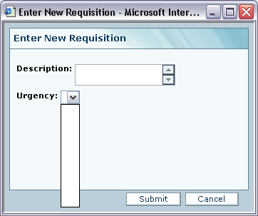 To specify the possible values for Urgency, we’ll need an initialization process in the Enter New Requisition popup. The initialization process will run each time the Enter New Requisition popup is opened and will populate the Urgency drop down list with the possible values to choose from: