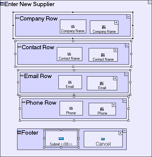 Add the following display elements (template in parentheses): Company Row (Row) Company Name: (Label) Company Name (Text Input Field) Contact Row (Row) Contact Name: (Label) Contact Name (Text Input Field) Email Row (Row) Email: (Label) Email (Text Input Field) Phone Row (Row) Phone: (Label) Phone (Text Input Field)  |