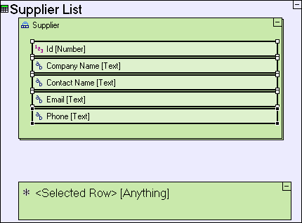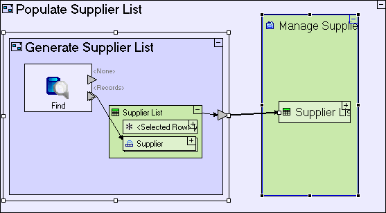 Add Database/Find. Reuse the Supplier List display as a data structure by dragging it from repository/outline. Link Find/<Records> to Supplier List/Supplier. Link Supplier List to the Generate Supplier List exit  |