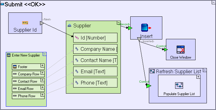 Add Database/Insert. Link Supplier data structure to Insert/<Record> Add Basic/Action. Name it Refresh Supplier List. Add a Control trigger to it. Link Insert/<Inserted> to the Refresh Supplier List/Control. Add Display Actions/Close Window. Add a Control trigger to it. Link Insert/<Inserted> to the Close Window/Control.  |