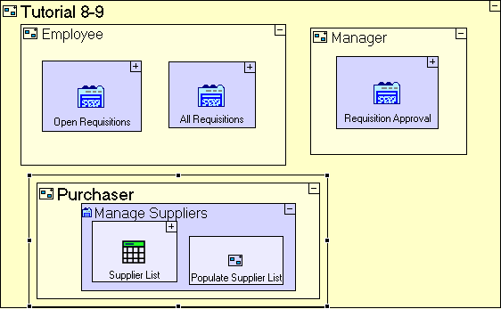 In the following stages we are going to model more views, in addition to the three already modeled. The additional views will be used by the purchaser and the shipping clerk. It would be a good idea to organize and group the views according to the different roles of users: Employee, Manager, and Purchaser.