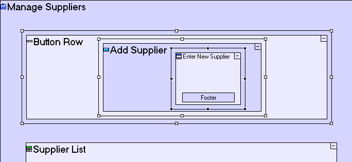 4. To Manage Suppliers view, add a Button Row with an Add Supplier button containing a Enter New Supplier popup.